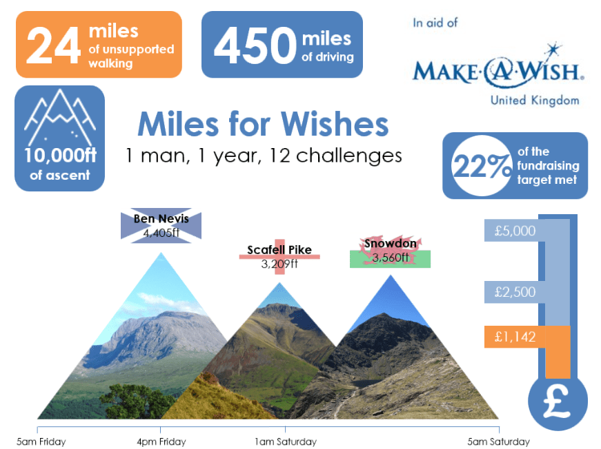 Walking the Three Peaks in this way means I get a full day to travel up and then properly rest to Fort William before starting the Challenge. It also means that the first two mountains are climbed in daylight, particularly as Scafell is the hardest to navigate. The downside being that the drive to and ascent of Snowdon is done at night, but I feel this is the best option for me personally.