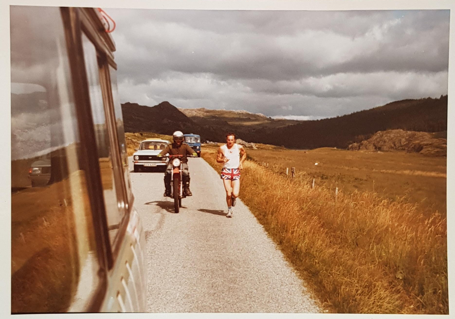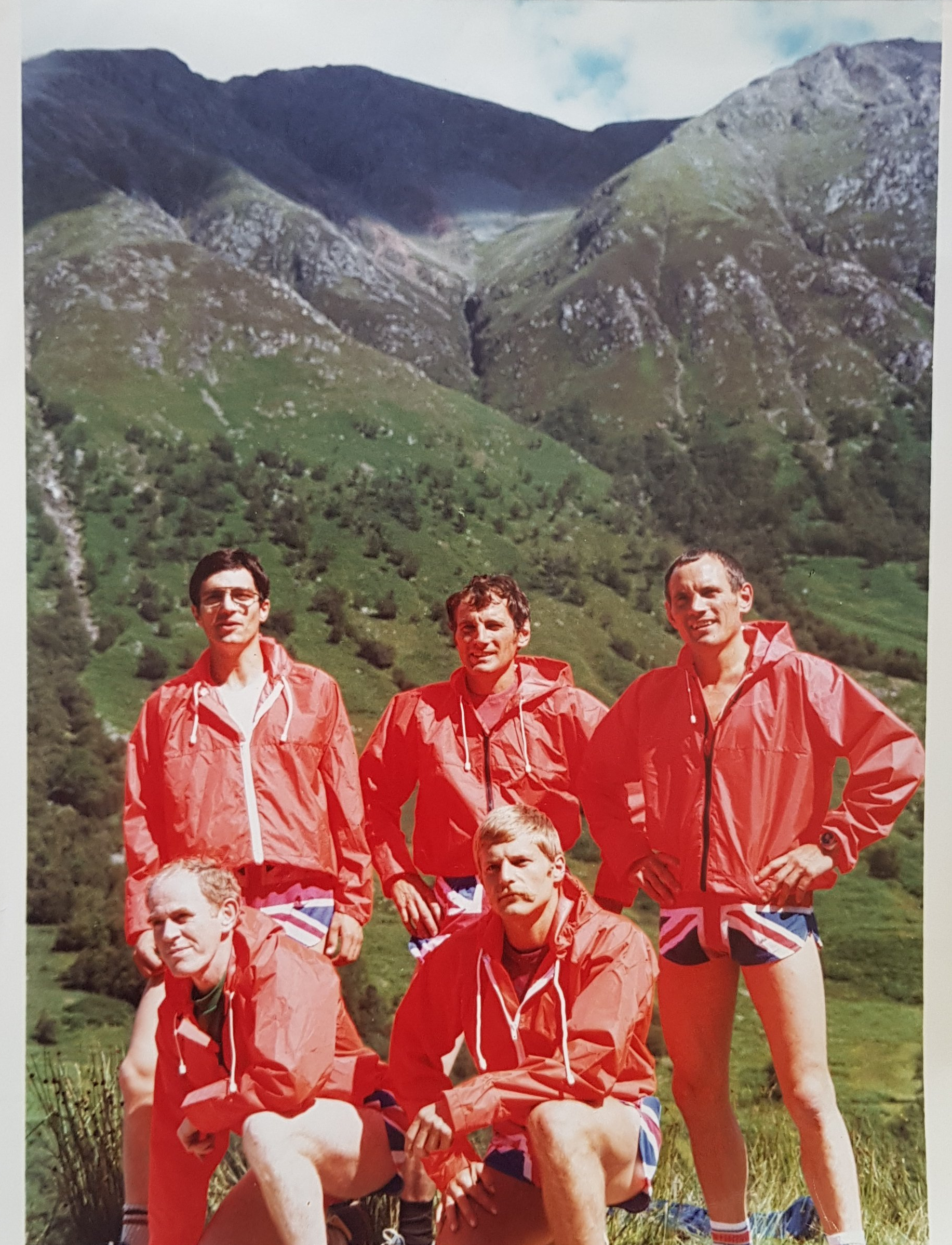 The scene from the bedroom window was like you find on a picture postcard, the mirror finish from Loch Linnhe reflecting the majestic mountains all around, the emmets were on the move, bustling along the main drag of Fort William. We were not here as tourists, this day had been planned many months before, this day was August 7th and at 1200hrs John O’Callaghan, Dave Robinson, Dave Ford, Kevin Duggan and Pete Ford were going to challenge the Three Peaks Record attempt – Ben Nevis, Scafell Pike and Snowdon. At 1100hrs the gladiators emerged from their various hideaways, having been put up for the night at friends homes. All had their favourite shoes on – flats, ripples, studs. However they all had one thing all had in common – Ronhill’s Union Jack shorts, appropriate because we were going through Scotland, England and Wales.