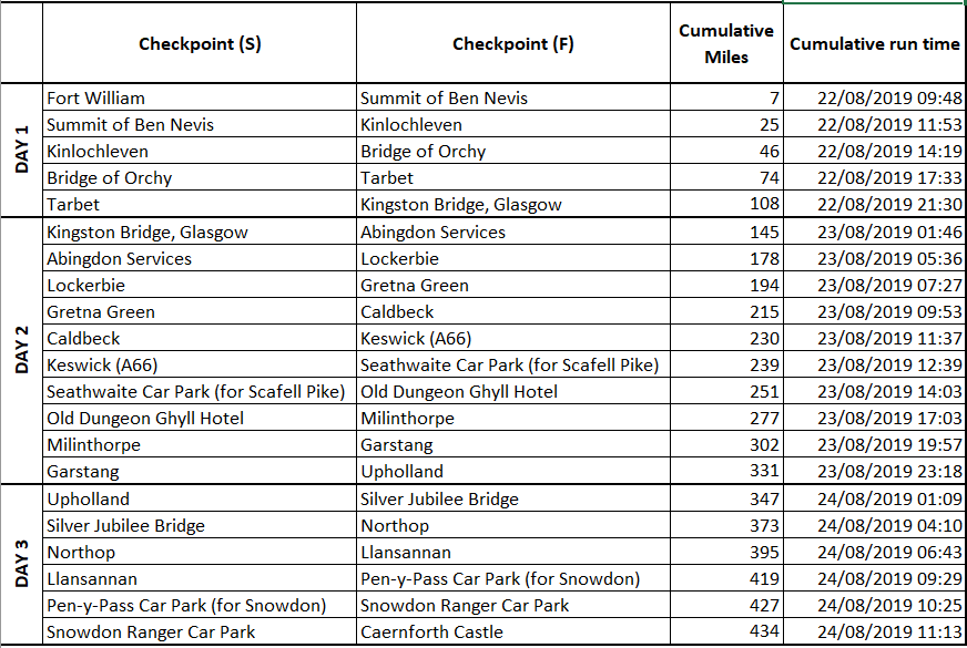 We’d welcome your support along the way – whether that’s on social media (links below) of by physically coming out to support us at the beginning, on route or at the end. Below is the broad itinerary, based on running the route at record pace, as planned. This could obviously change, so please do keep an eye on our Facebook page or drop us a message to find out exactly where we are.