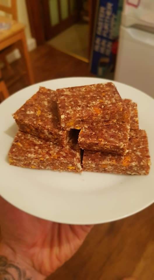 • Pull your block out of baking dish by lifting parchment and cut into 15 – 20 bars (aim for no more than 50g per bar). Add to an airtight container and store in the fridge for up to 2 weeks.
