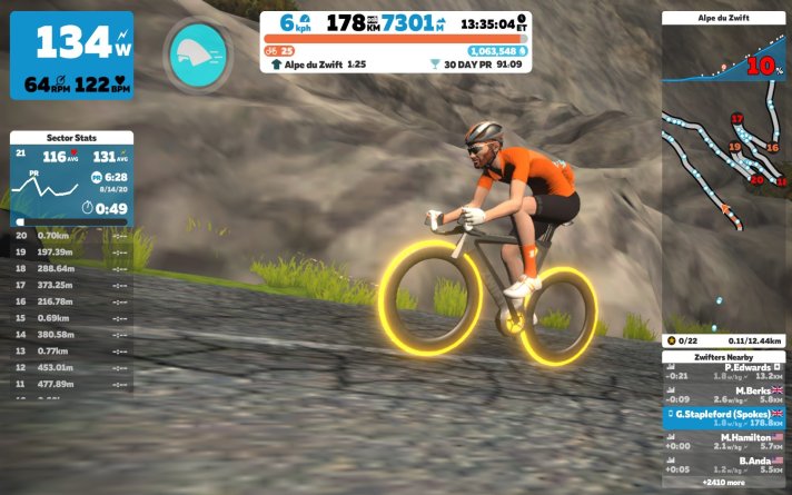 Picking myself up again, once home, was hard – all the confidence from LDN-LE-LDN had gone. However, having the all new Zwift Racing League starting provided a welcome distraction. Spokes Racing Team was born and our two teams began racing with thousands of other racers from across the world. I’m not a racer by nature, I don’t have that short range power, but boy was it fun. Racing is tough on Zwift, it’s max effort for the first 5 mins before the bunch calm and then it’s hanging on to what you’ve got left. On the plus I got some decent results and saw my FTP increase week on week.