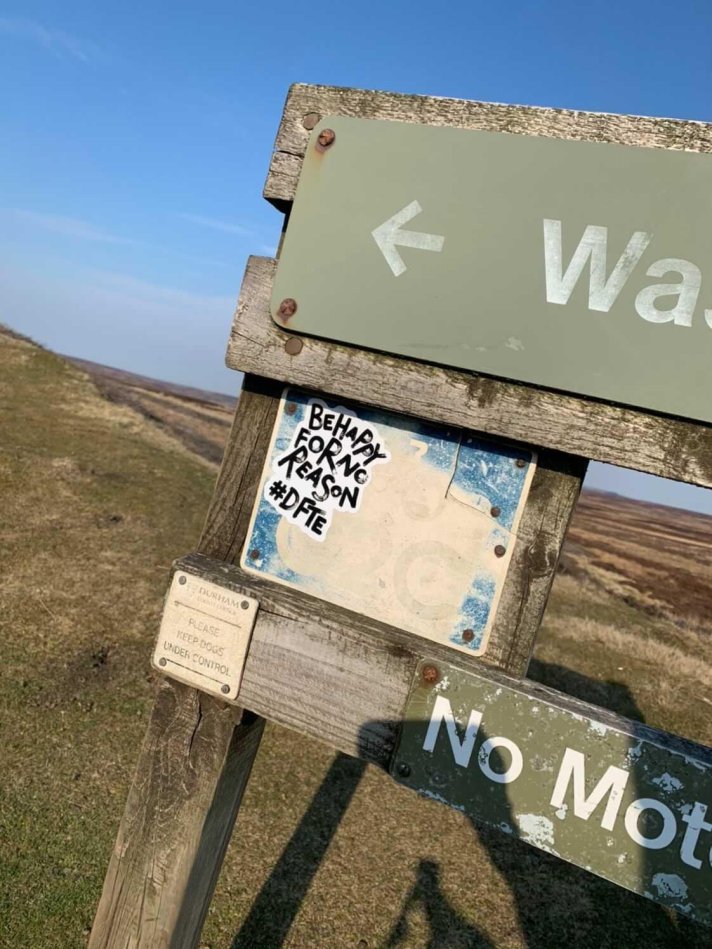 There waiting in the car park was my wife, I don’t know whose smile was bigger. I couldn’t eat at the point; I just couldn’t take in solid food, was it nerves, adrenaline or had I had my fill? I downed a can of Coke, filled my bottles and checked what gels and snacks I left in my bag for the last slog to the beach. I crawled up the last small climb and onto Waskerly Way. I’d left a sticker here some months before on the very weathered C2C sign, I had rode to Parkhead Station that day and placed that sticker thinking, knowing the next time I see that I’d be doing the Coast to Coast. I’d be on the home stretch, it simply said #behappyfornoreason.