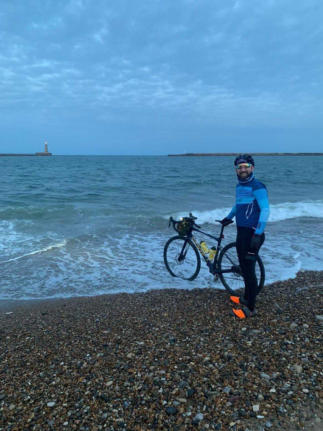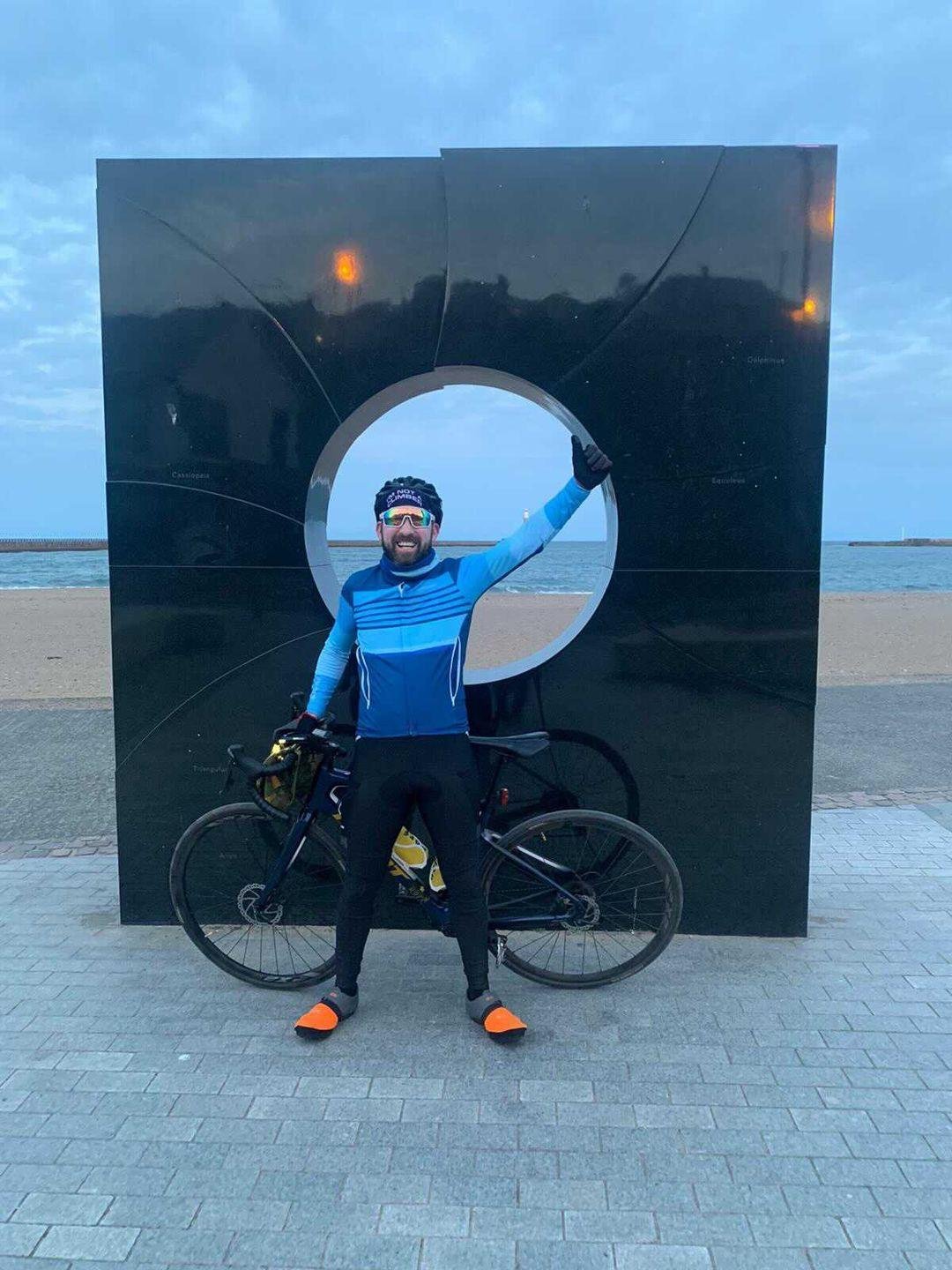 There were two diversions well marked by Sustrans, I rounded a bend, went under the motorway bridge and there it was; my first sight of the River Wear and the Spire Bridge. I’d never been so happy to see Sunderland and don’t think I ever will be again. From this point on it’s a bit of blur, the thoughts of failure and disappoint disappearing faster than the light. I raced along the river under the Stadium of Light and saw The Glass Centre. I could smell the sea, I got a text that simply said ‘I’m on the beach x’. My legs all of a sudden went heavy, I freewheeled through the Marina. I hit the beach front seeing the lighthouse. I was here! My wife was waiting by the marked finishing point. I almost crashed as I forgot to unclip, I was so happy to see the finish line all other thoughts left my mind.