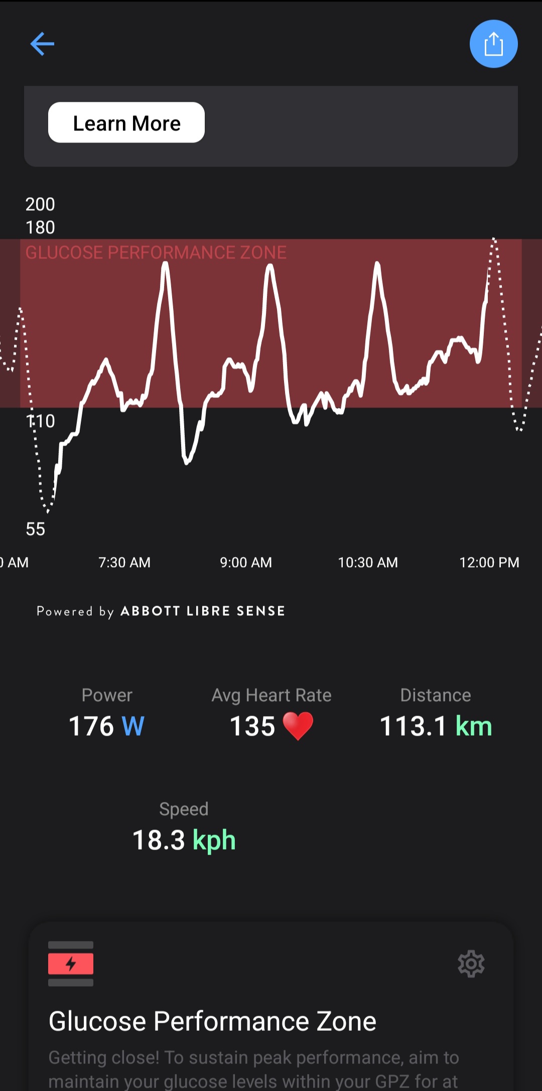 The screenshots above show the post workout data, once analysed by the app. It gives you an overview of what happened to your glucose levels during the activity – how well you stayed within the ‘performance zone’, whether you fell out of it and if your glucose levels suffered any sharp drops. The second of the two shots shows my glucose levels when taking on 4 ascents of the Alpe on Zwift. There is a slow rise as a I drank 500ml of KMC ISO Mix and a bar during the ascent. the sharp peak is when I got off the bike of the 10min descent and ate real food, like wraps, or had an Ensure shake (coincidentally also made by Abbott, who knew). In essence the data is showing you how your body reacts to the fuel you put in it – the aim being to fuel well, continuously to avoid the sharp spikes and rapid falls and therefore consistently better.
