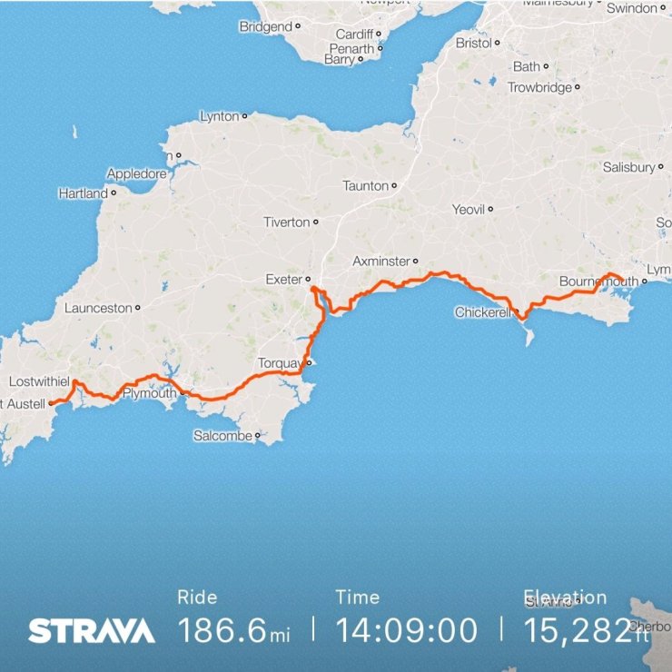 In 2018, my second year of cycling, I aimed to push myself harder and the South Coast Sprint was the start. The challenge was to cycle 400 miles along the beautiful South Coast of England, starting at Dover, Kent with the aim of reaching St Austell, Cornwall within 40hrs. With over 20,000ft of climbing this was one of the most demanding cycling challenges I’ve taken on.